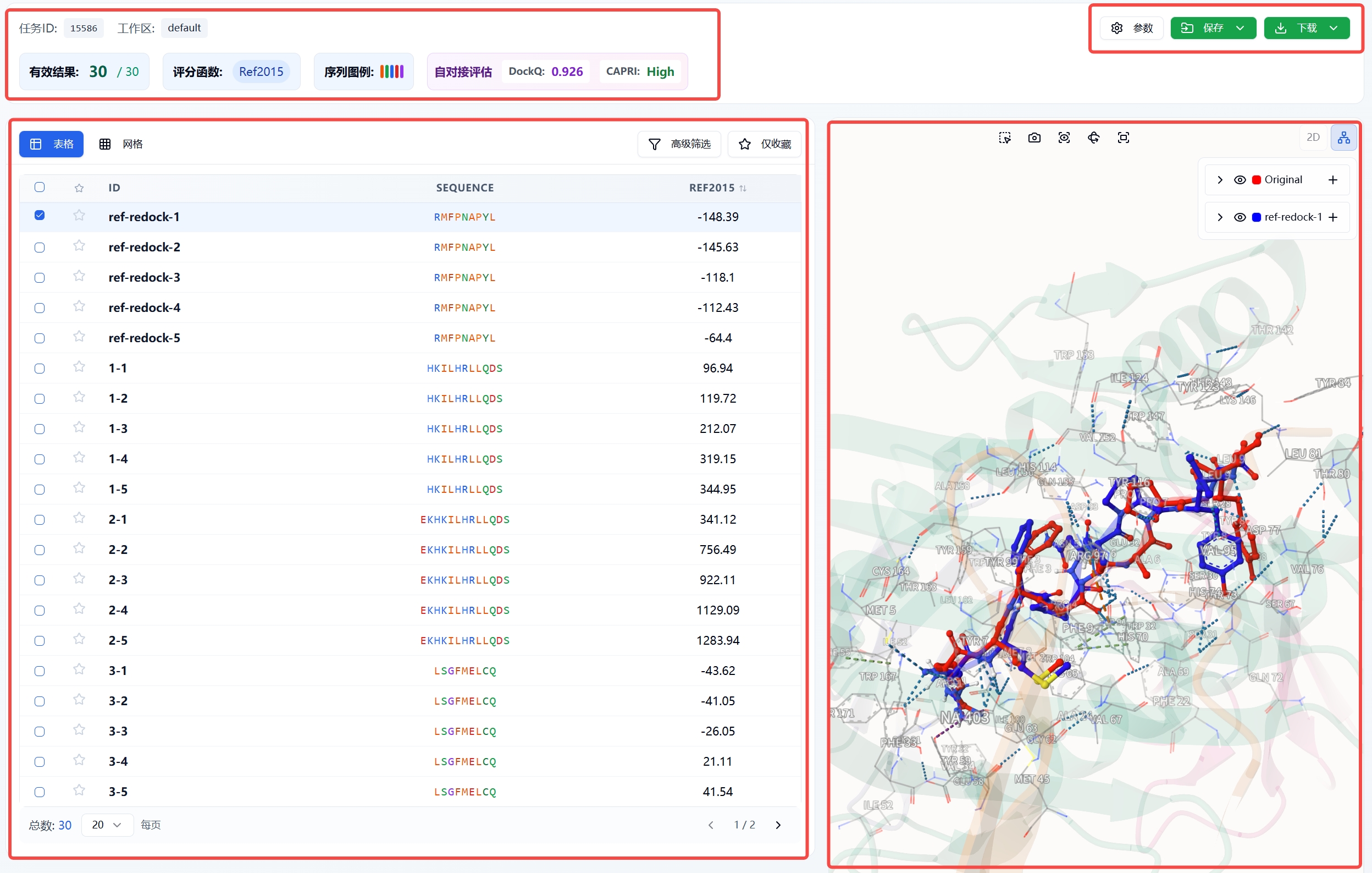 - Self-Docking Assessment: When setting docking parameters, if the peptide ligand in the complex is selected as the center, self-docking will be performed on that ligand, and the self-docking assessment will be displayed and shown below (if multiple self-docking results are output in the table, the value in the self-docking assessment corresponds to the structure with the lowest REF2015 score).